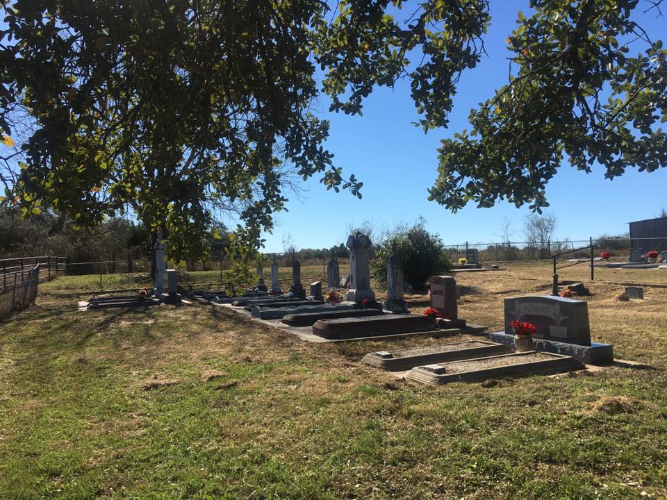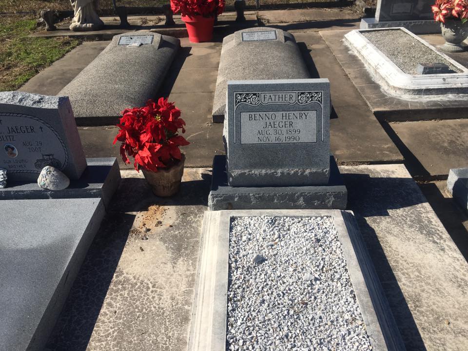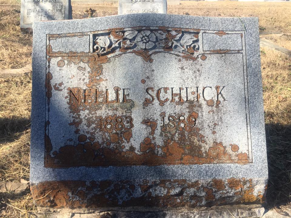 Check this out! When I was cleaning, I found her initials on one of the bricks framing her grave. When we return in February, I’m going to check the other Schlick graves for similar engravings.