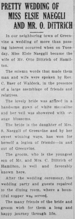 Elsie (Naegeli) Dittrich was the daughter of Johann Albert and Francisca (Witte) Naegeli. She was born on March 6, 1891 and was married to Karl Otto Heinrich Dittrich on September 30, 1913. The Brenham Weekly Banner describes the wedding as a beautiful affair that was attended by an abundance of family and friends. The lovely bride wore a white satin gown and a veil showered with orange blossoms. The article goes on to say that “…by her sweet, winning ways, (Elsie) has won for herself a legion of friends in and out of Greenvine.” The bridegroom is similarly noted to be well known and well liked. Following the ceremony, the wedding party and guests retired to the dining room for supper.